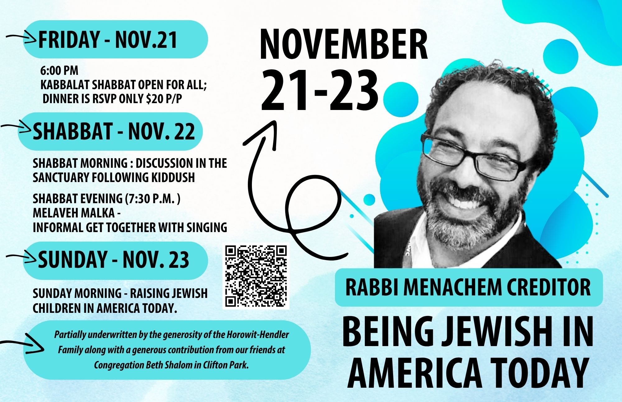Thank you for being a Sponsor of our Kallah Weekend with Rabbi Menachem Creditor: "Being Jewish in America Today". Sponsorship for the weekend is $360.00 and reserves 2 spots at our Kab Shab dinner as well as 2 spots for our Sunday Schmooze. Please consider supporting this wonderful weekend.